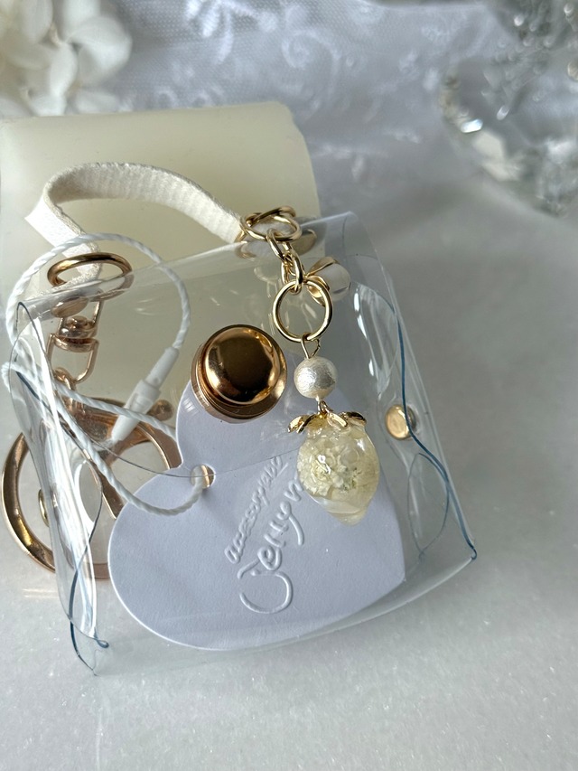 ホワイトゴールドトナカイチャーム付き あなたの好きを詰めて飾って 持ち運べちゃうキーホルダー 推しの缶バッチや写真 思い出のアクセサリー 好きだった鉛筆キャップ 入るものなら何でも⭕️ jellymeのお花を詰めてつくったリボンや 花布コットンパールをぶら下げた かわいいキーホルダーです 全長約14cm クリアバックのサイズ約7×8cm 底マチ約2.5cm