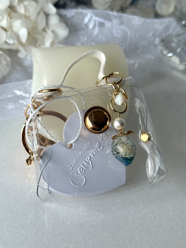 青いちごチャーム付き ※3点のうちどれかをお届けします あなたの好きを詰めて飾って 持ち運べちゃうキーホルダー 推しの缶バッチや写真 思い出のアクセサリー 好きだった鉛筆キャップ 入るものなら何でも⭕️ jellymeのお花を詰めてつくったリボンや 花布コットンパールをぶら下げた かわいいキーホルダーです 全長約14cm クリアバックのサイズ約7×8cm 底マチ約2.5cm