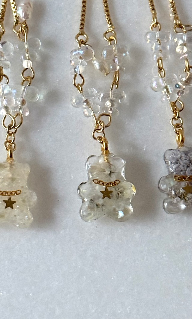 クマちゃんブレスレットホワイト③ スライダーボールチェーンで つけ外しが楽なブレスレット 人気のクマシリーズから ブレスレットが仲間入り✨ モコモコよお洋服と合わせても可愛い 小さな淡水パールが一粒揺れる 大人も可愛くつけられるデザインになります ─────✤──────♡──────✻─── 商品詳細 18KGPスライダーボールチェーン使用 ニッケルフリーマルカン ステンレス9ピン使用 レジンの中はかすみ草やシェルなど 淡水パール ❥発送について ・発送はクリックポストとなります ご自宅の郵便ポストへお届けとなります ※金具交換について (ピアス⇔イヤリングへの交換無料で行います 交換ご希望の場合は必ず、備考欄にご記入くださいませ) ピアスはチタンポストピアス、 医療用サージカルステンレスピアスがございます 作品によっては交換できないものもございます ご了承くださいませ ❥最後に ・ハンドメイドのため形・模様・色などに個体差が出る場合がございます ・ひとつひとつレジンパーツはお作りしています 花材などの個体差や配置の関係上お写真と全く同じにならない場合がございますが、同じ花材を使用しお作りしてお届けいたします ・お使いのモニターなどにより実際の商品と色合いが違って見える場合がございます ・梱包には細心の注意を払っておりますが、配送中の破損は責任を負いかねますので ご了承くださいませ ・アクセサリーのお取り扱いは、ご自宅にある大切なアクセサリーと同様、優しくお使いいただけたらと思います